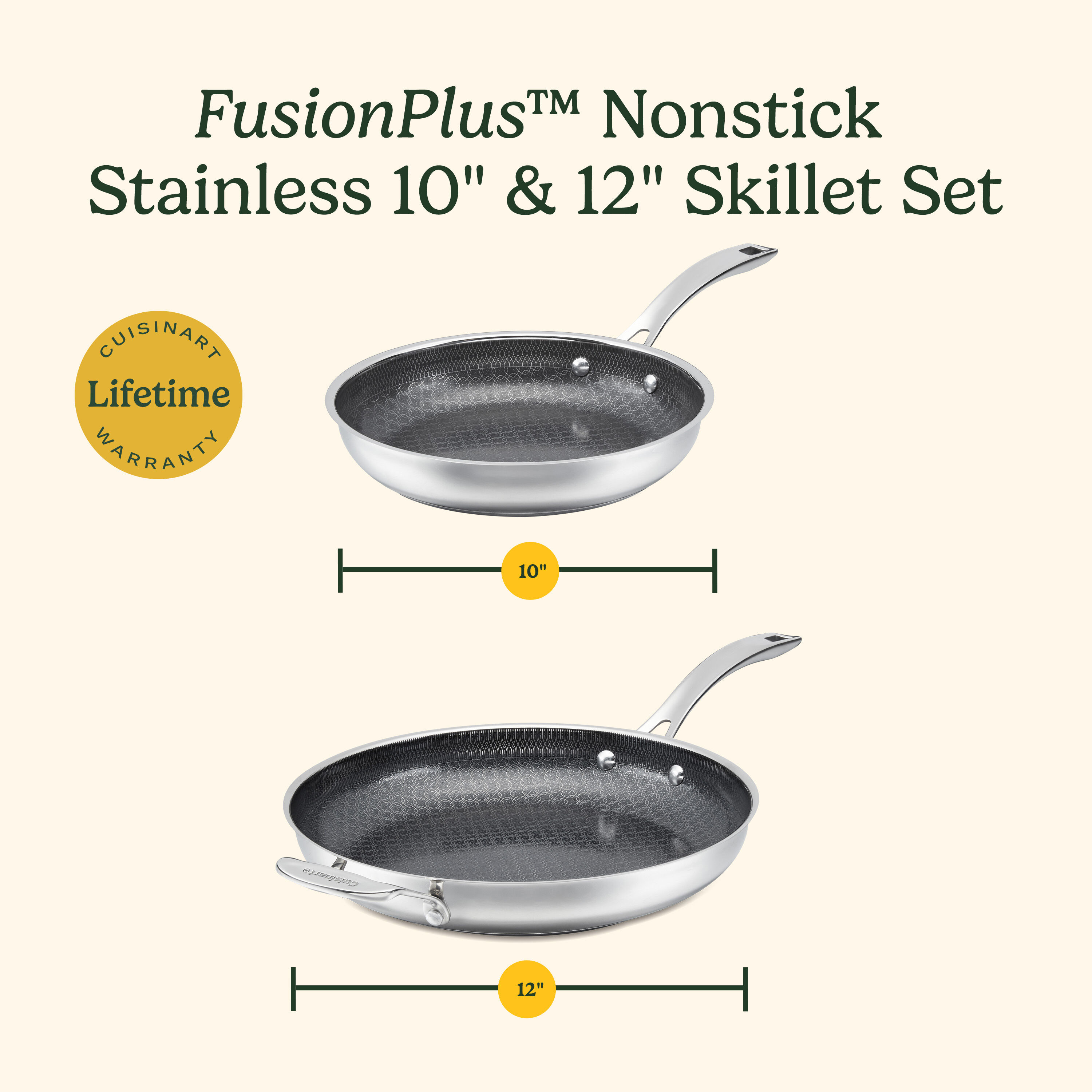 Elevate your everyday cooking with the Cuisinart® FusionPlus Nonstick Stainless Steel 2-Piece Cookware Set. The 2-piece stainless steel cookware set features professional stainless steel construction, polished exterior finish, and aluminum-encapsulated base for even heating, letting you fry, brown, and sear like a professional. Cool Grip™ handles stay cool to the touch, and the pan set is both dishwasher and oven safe up to 500°F (lids 450°F).