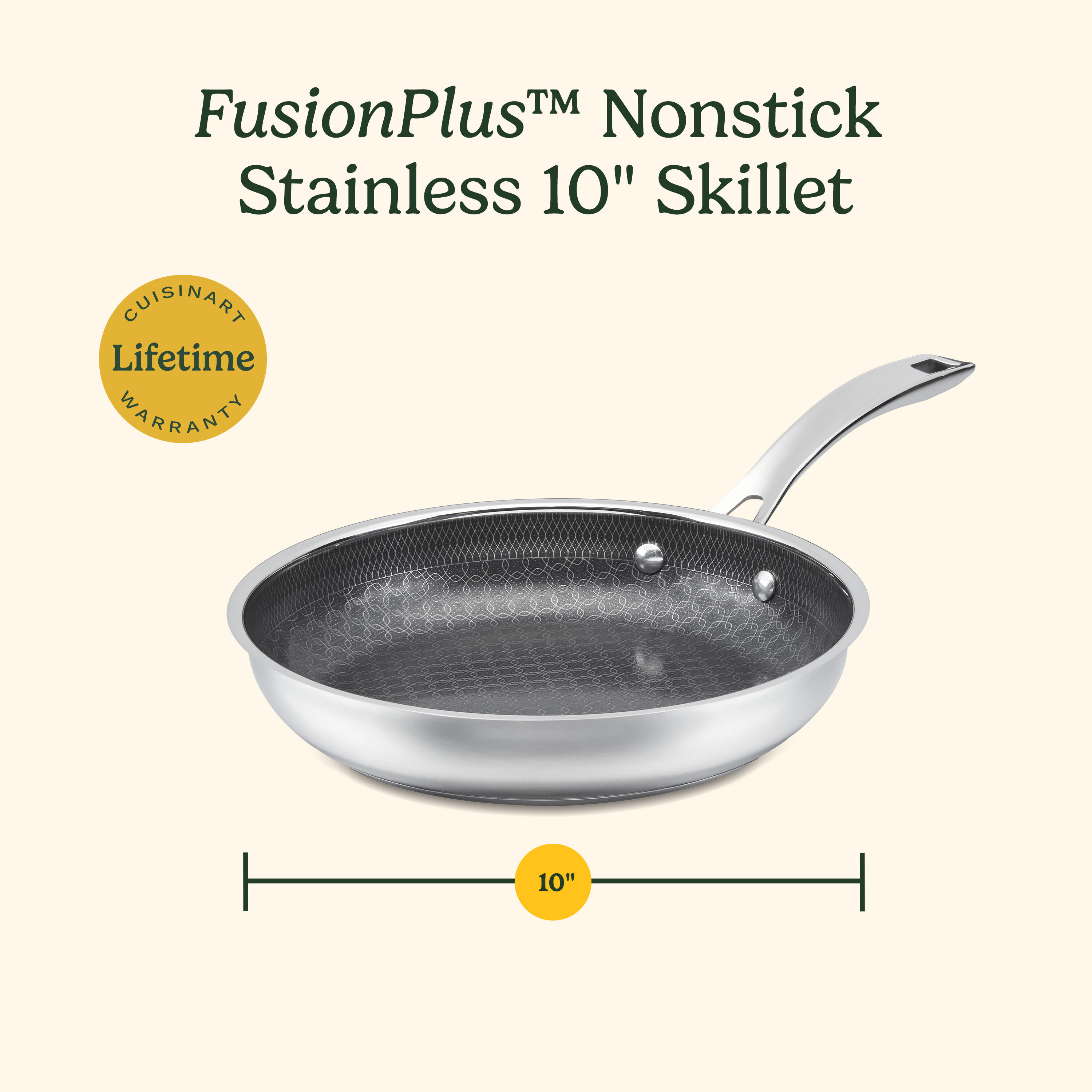 Transform your cooking experience with Cuisinart’s FusionPlus™ Nonstick Stainless Cookware, featuring the innovative PURELYSEAR™ Ceramic Nonstick Technology. This 10” skillet is best for cooking tasks such as frying family-sized portions of eggs, sautéing vegetables, searing steaks, chicken, or salmon, and preparing one-pan meals. It ensures perfect searing and superior release, featuring a scratch-resistant ArmorGuard® interior, durable stainless steel construction, and an aluminum-encapsulated base for fast, even heat distribution. Riveted Cool Grip™ stick handle stays cool on stovetop, and the tapered rim ensures drip-free pouring. Compatible with all stovetops, including induction, this PFAS-free, dishwasher-safe skillet comes with a lifetime warranty for lasting durability.