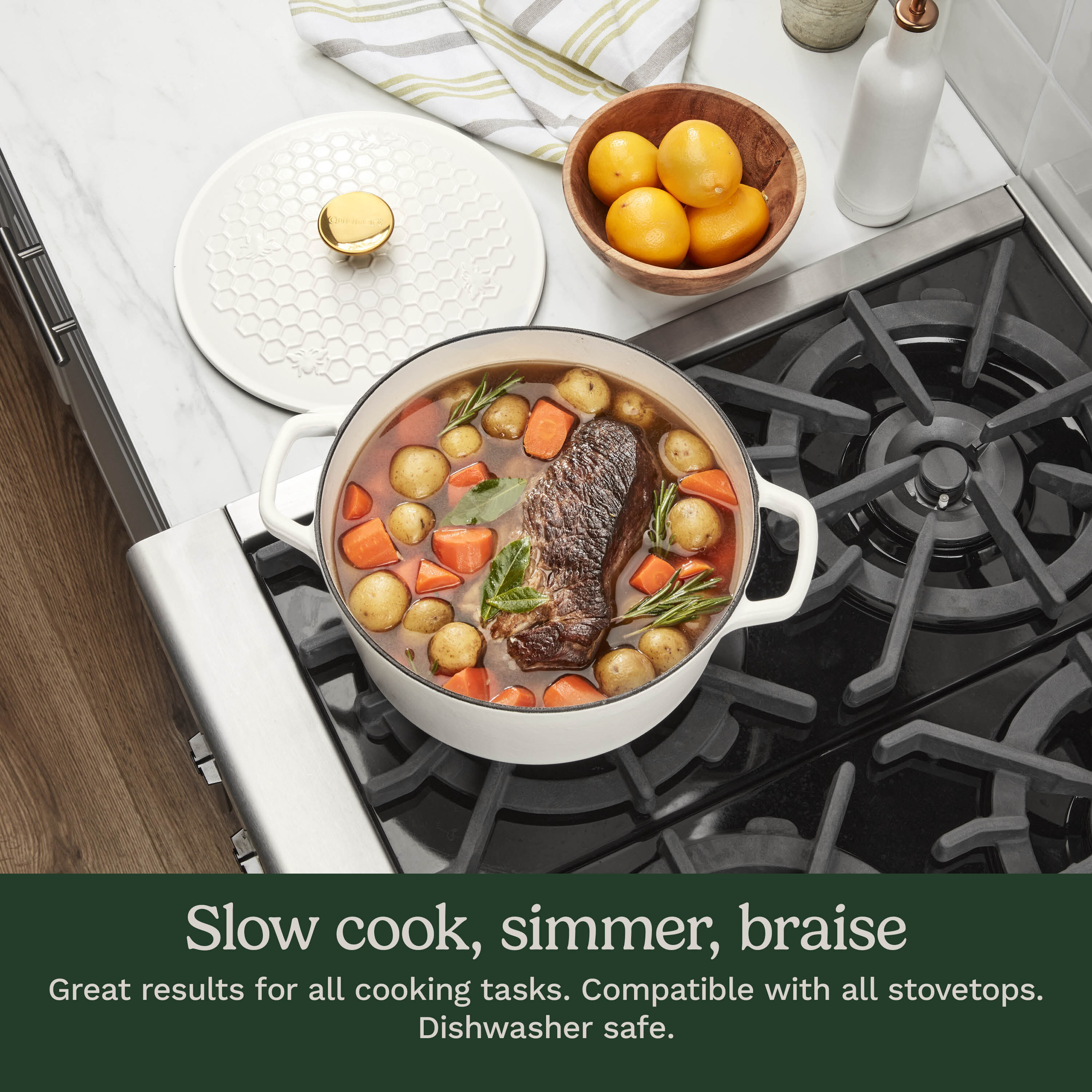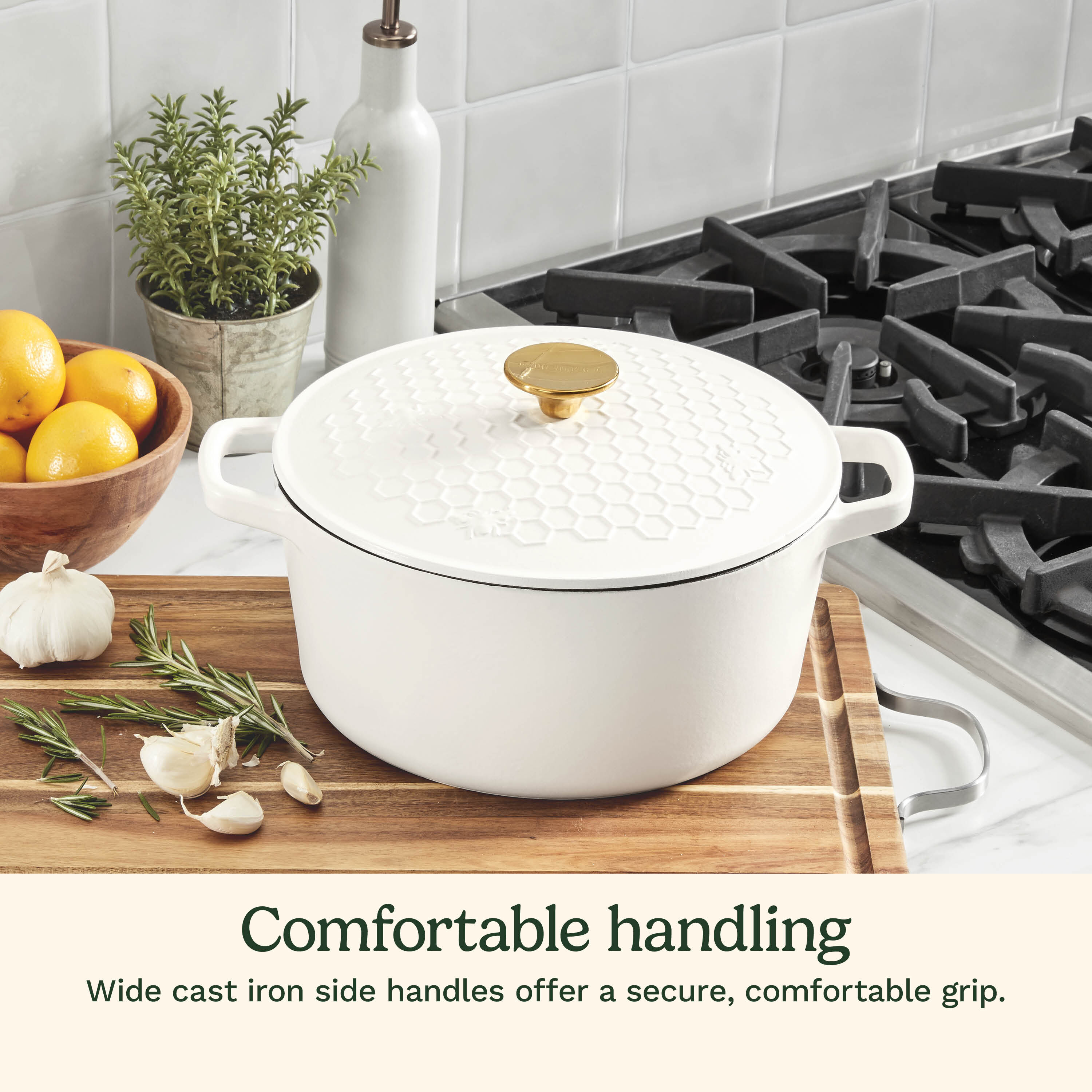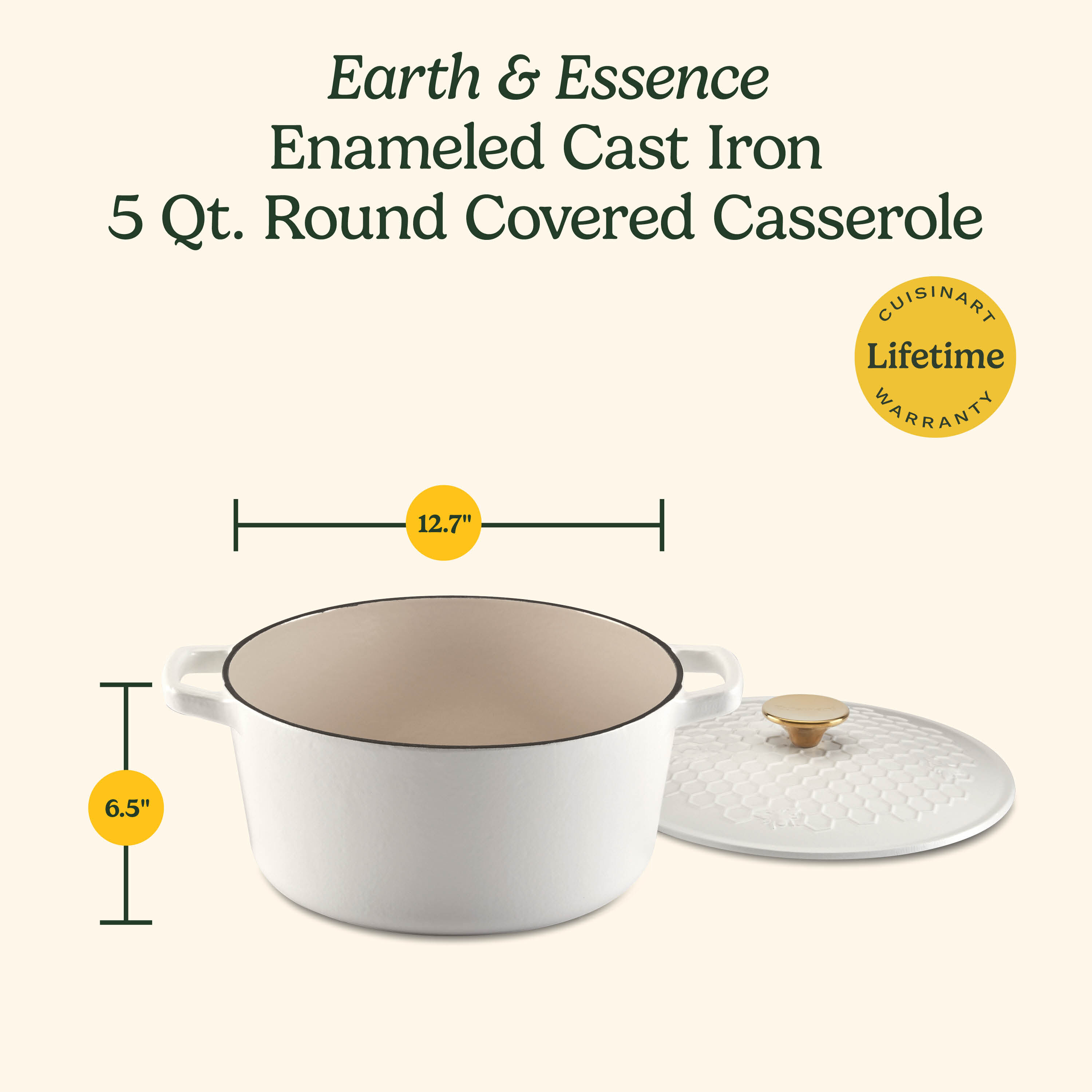 This 5 Qt. cast iron casserole features a durable matte white exterior and a porcelain enameled interior, making it both stylish and functional. The lid has a beautful Honeycomb design with a brushed gold knob for a modern touch. Designed with wide grip side handles and a specially crafted lid, it’s compatible with all stovetop ranges, including induction. It’s safe for use on the stovetop, in the oven, and under the broiler—up to 500°F—and is also dishwasher safe for easy cleanup.