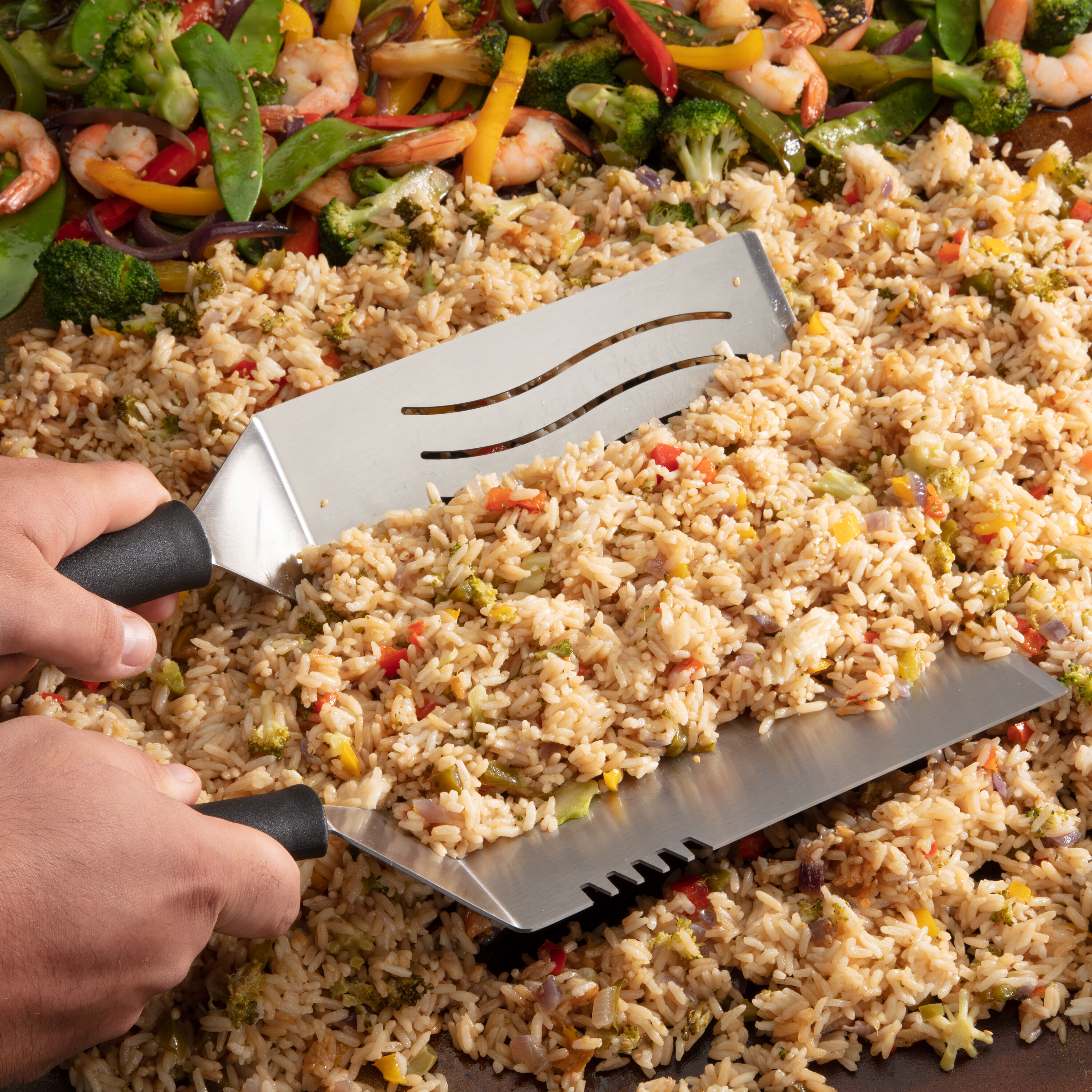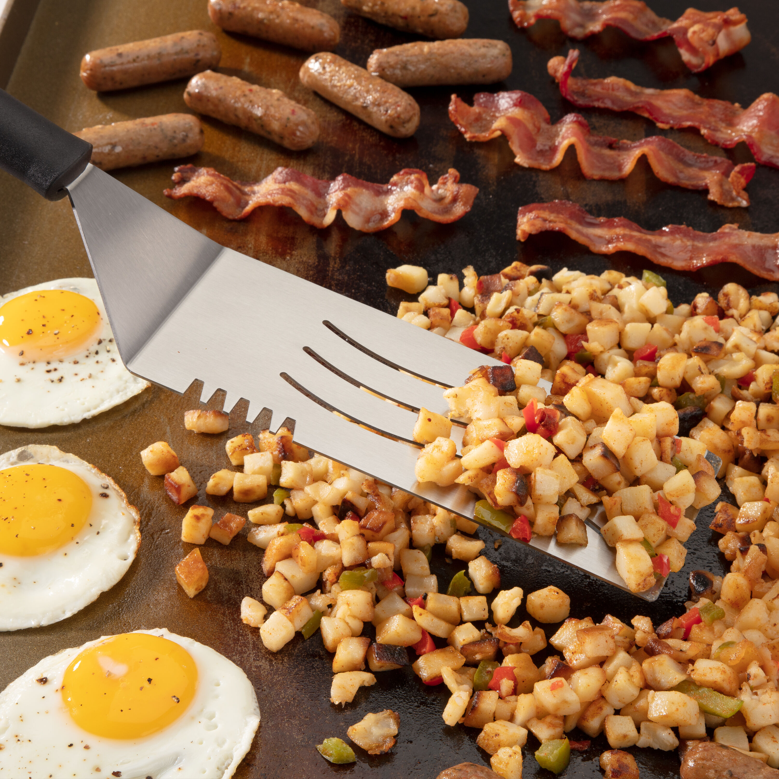 The Cuisinart 12 Piece Griddle Set provides you with everything you need to master the griddle! This comprehensive set features 2 griddle spatulas, a flexible spatula, locking tongs, multi-purpose scraper, 6″ melting dome, 2 squirt bottles, and 4 silicone egg rings. The griddle spatulas include one solid and one perforated spatula for handling anything you throw on the griddle. The perforated design allows for excess grease to drip through for healthier cooking. The flexible spatula is ideal for more delicate food like seafood, eggs, pancakes, or veggies. Use the multi-purpose scraper for quick chopping on the griddle surface or a quick cleaning in between rounds of food. The 4 silicone eggs rings will help you create perfectly shaped eggs for bacon and eggs or egg sandwiches and the non-stick material easily slides off, keeping your eggs in tact. The 6″ melting dome is ideal for melting cheese on burgers or concentrating heat to speed up cook times. What griddle set is complete with out squirt bottles? The translucent bottle are ideal for keeping water and oil handy while griddling.