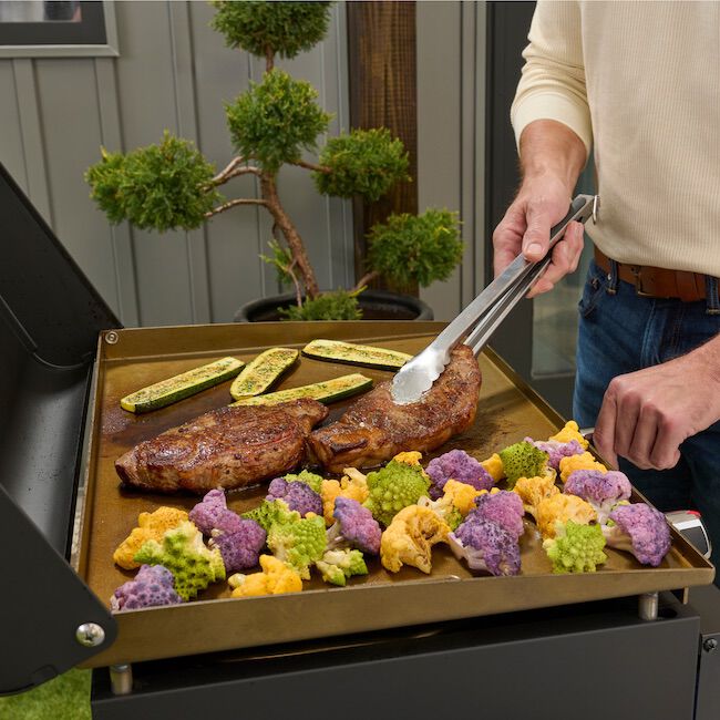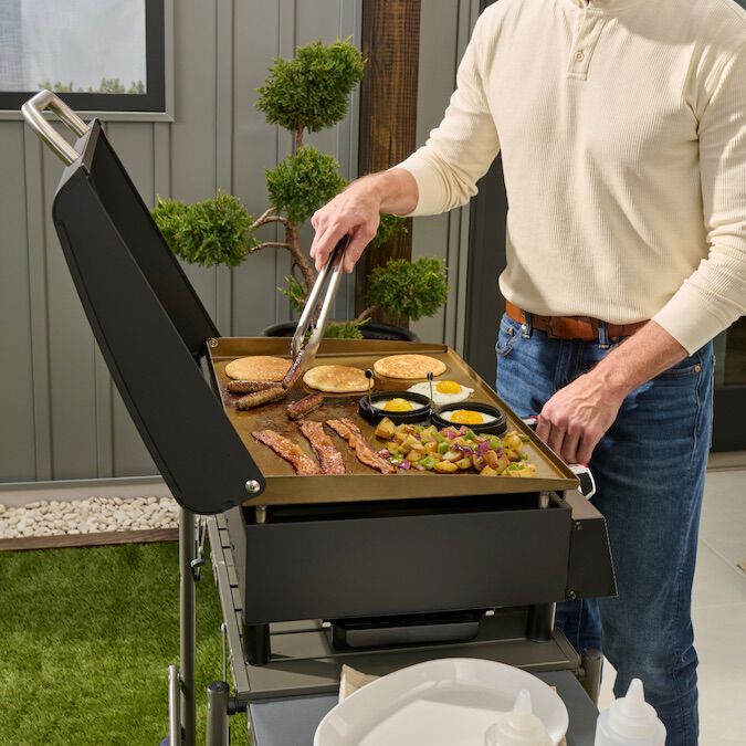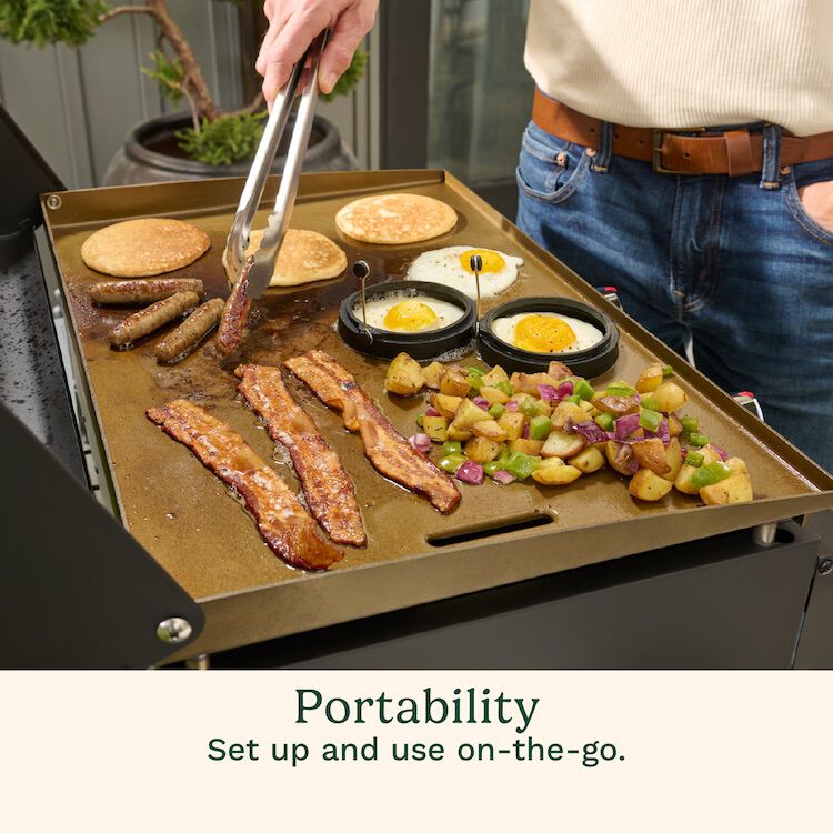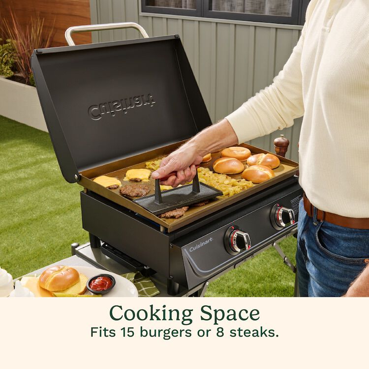 Looking for easy, versatile cooking at home or on-the-go? The Cuisinart 22″ Tabletop Gas Griddle is the perfect solution. Whether you’re cooking for a small crowd or packing it up for outdoor adventures, this compact griddle delivers. With enough space to cook 15 burgers or 8 NY strip steaks at once, it’s ideal for camping, tailgating, picnics, or any outdoor event. The built-in hood protects the griddle when not in use and doubles as a way to melt cheese on burgers. Setup is quick and easy—just attach the legs, hood, and grease cup brackets, and you’ll be ready to cook in 10 minutes.