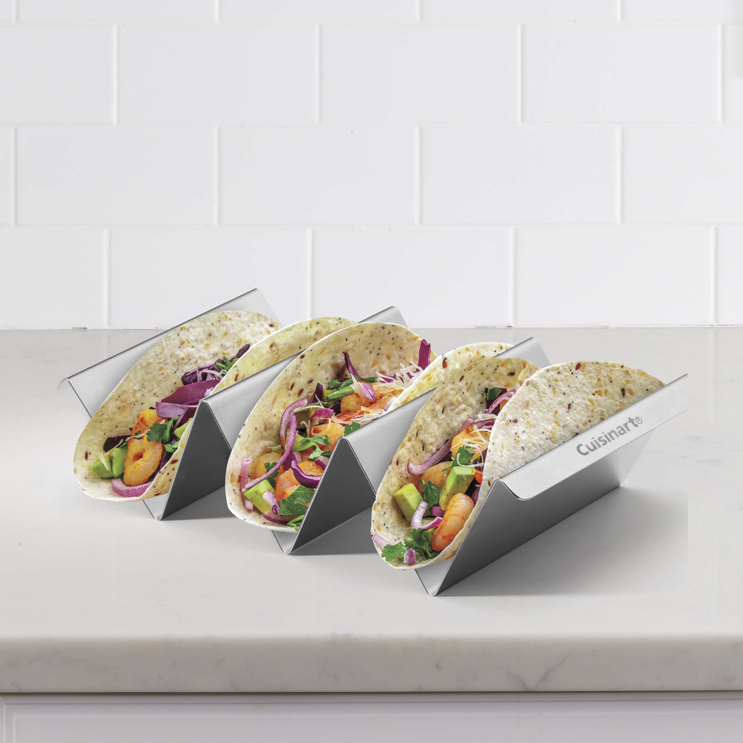 Perfect for crisping and baking soft tortillas or hard taco shells for the whole family! Durable stainless steel allows for safe and sturdy handling. Taco trays are designed to hold food with a solid grip and secure ingredients when bringing from kitchen to table. Use the taco tray for a variety of dishes including soft tacos, hard tacos, fajitas, burriots, sandwiches, hot dogs and more.